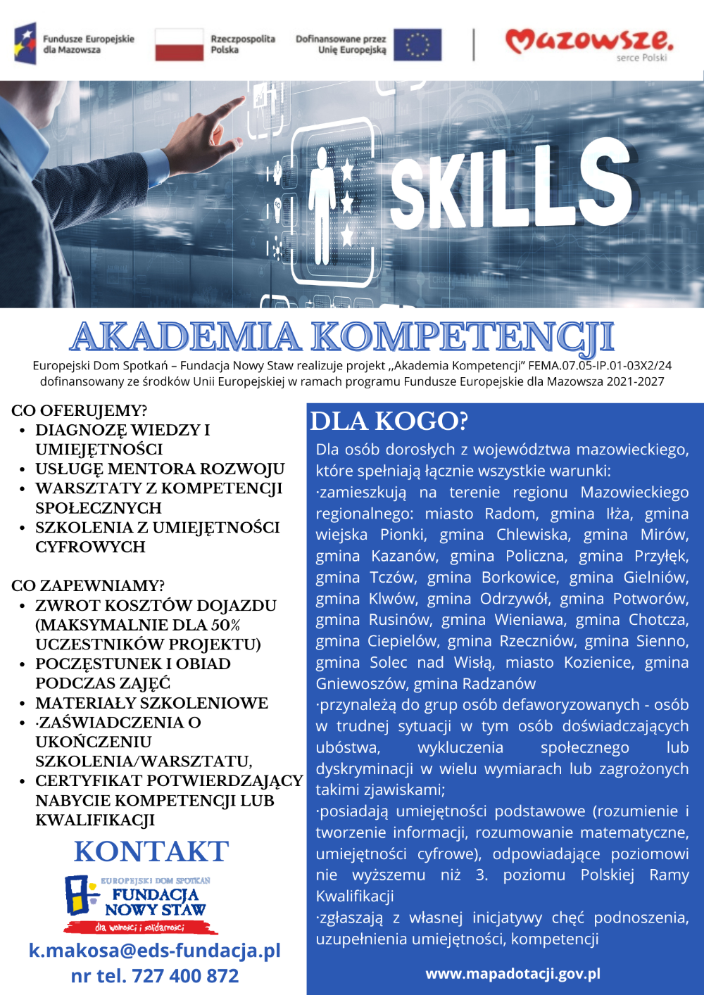 Program realizowany jest we współpracy Fundacji Przedsiębiorczości Kobiet z Zakładem Doskonalenia Zawodowego w Płocku i przy wsparciu merytorycznym Płockiego Parku Przemysłowo-Technologicznego S.A., a dzięki dofinansowaniu z Samorządu Województwa Mazowieckiego   udział w nim jest bezpłatny.